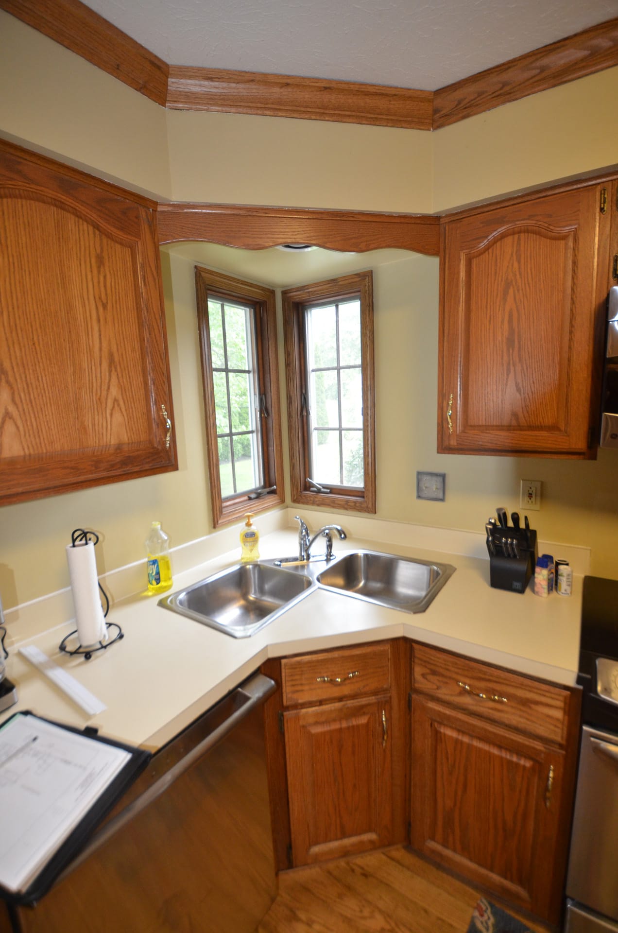 Our clients wanted to modernize their 1980's oak kitchen. They wanted to remove their peninsula that separated their kitchen from their eating area and create a large island where guests could gather. The resulting kitchen is light, open & airy. The white cabinets contrast beautifully with the darker furniture-grade island and refinished oak floors. Since the island is large, the quartz counter tops make a marvelous impact with the subtle color contrast and movement.